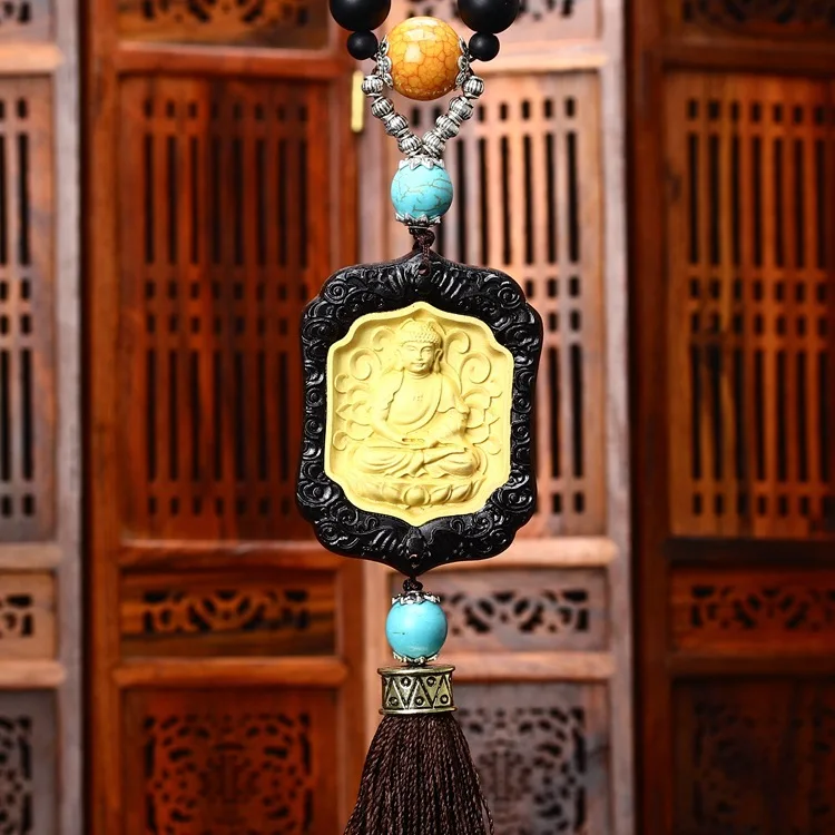 Wood Sculpture Car Hanging Ebony Inlaid Boxwood Buddha Brings Safety Car Hanging Buddhism Supplies